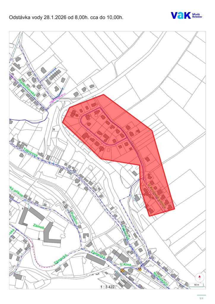Oznamujeme občanům, že ve středu 28. ledna 2026 v době od 8:00 do cca 10:00 hodin, dojde z důvodu opravy vodovodu k plánovanému přerušení dodávky pitné vody v Bělé pod Bezdězem, a to v ulici U Krupské silnice, viz. přiložená mapa.