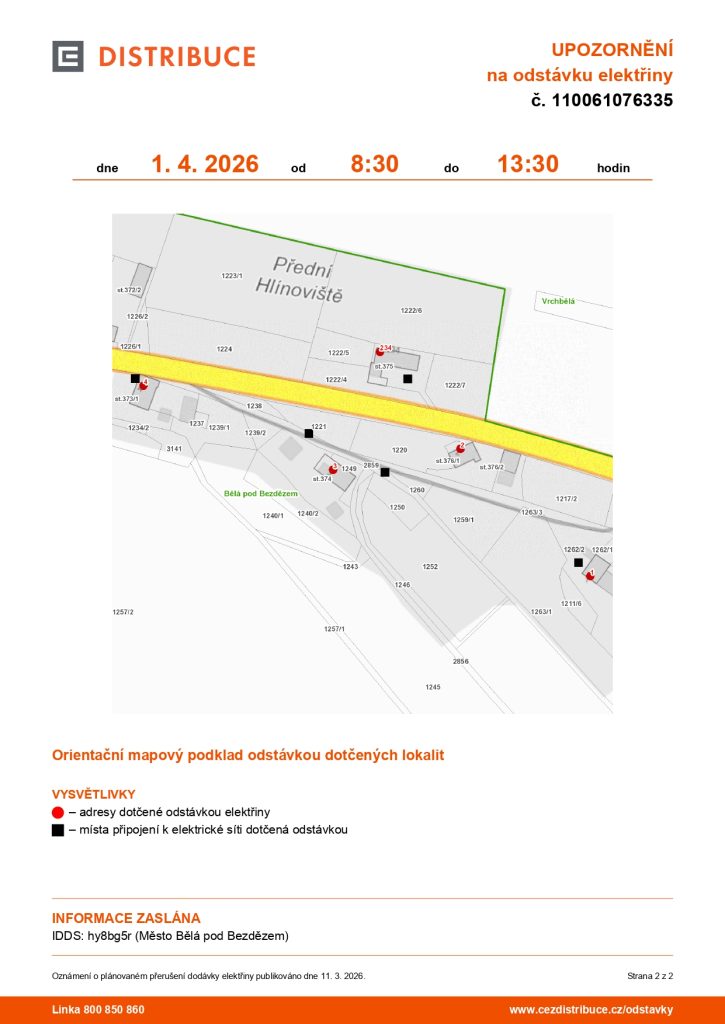 Ve středu 1. dubna 2026 v době od 08:30 do cca 13:30 hodin proběhne plánovaná odstávka elektřiny v části obce Hlínoviště: č. p. 1, 2, 3, 4 č. ev. 234, viz.přiložená mapa.