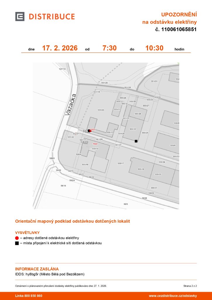 V úterý 17. února 2026 v době od 07:30 do cca 10:30 hodin proběhne plánovaná odstávka elektřiny v části obce Vrchbělá: