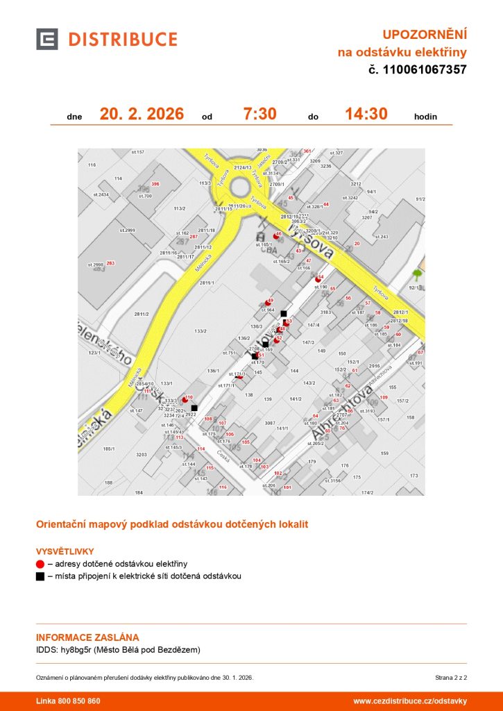 V pátek 20. února 2026 v době od 07:30 do cca 14:30 hodin proběhne plánovaná odstávka elektřiny v Bělé pod Bezdězem v ulicích:
