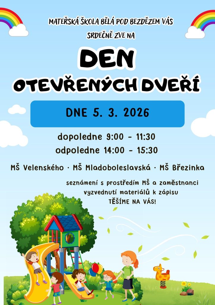 Mateřská škola Bělá pod Bezdězem zve všechy děti a rodiče na “Den otevřených dveří”.