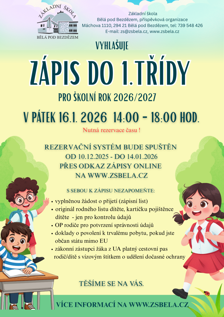 Základní škola Bělá pod Bezdězem, příspěvková organizace vyhlašuje svým ředitelem na pátek 16. ledna 2026 “ZÁPIS ŽÁKŮ do první třídy” pro školní rok 2026/2027.